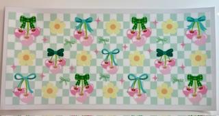 Sage green checkered back ground, light pink cherries, yellow flowers orange centers different green & teal bows.