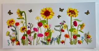 Clear background with different bright colored flowers & yellow butterflies.