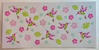 Clear background with pink & green humingbirds with pink light blue flowers and light green leaves.